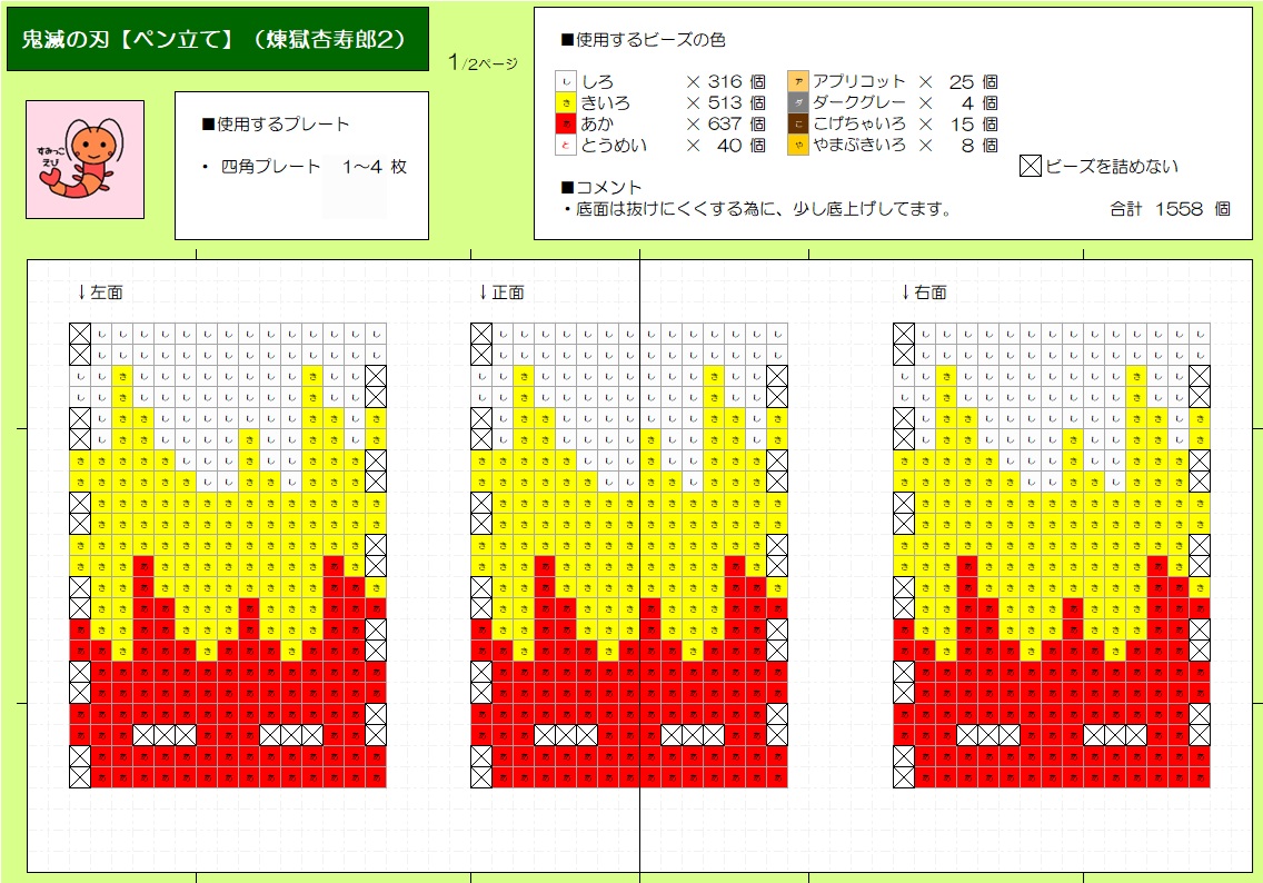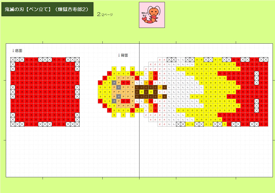 鬼滅の刃「ペン立て」(煉獄杏寿郎2)作り方 すみっこえび 5日前 パーラービーズで鬼滅の刃「ペン立て」(煉獄杏寿郎2)を作りました。図案と組立動画を掲載してるので、良かったら参考に作って下さい。 図案はこちら(全2ページ) 組立動画はこちら