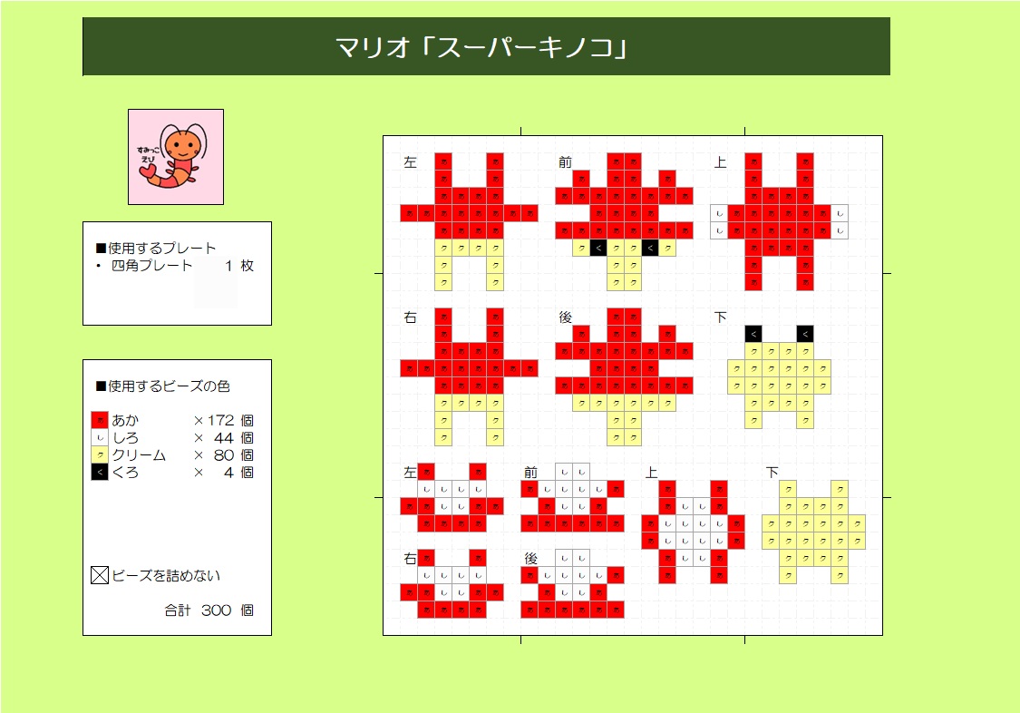 スーパーマリオ「スーパーキノコ」作り方 すみっこえび 10時間前 パーラービーズでスーパーマリオ「スーパーキノコ」を作りました。図案と組立動画を掲載してるので、良かったら参考に作って下さい。 図案はこちら 組立動画はこちら