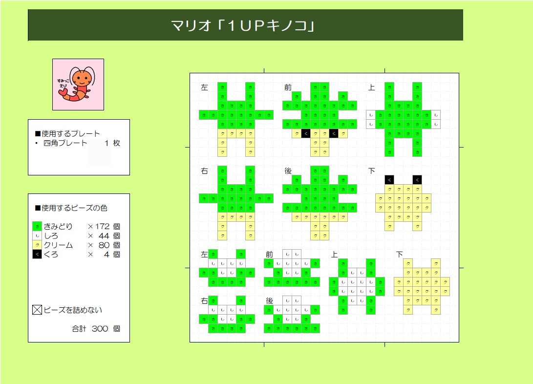 スーパーマリオ「1UPキノコ」作り方 すみっこえび 10時間前 パーラービーズでスーパーマリオ「1UPキノコ」を作りました。図案と組立動画を掲載してるので、良かったら参考に作って下さい。 図案はこちら 組立動画はこちら